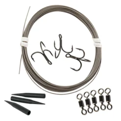Eine Raubfischangel mit hochwertigen Komponenten, die durch knotenlose Knoten und durch Verdrehen und Verschmelzen des Drahtes besonders sicher sind. Wählen Sie die Größe Ihrer Komponenten entsprechend der Größe Ihres Köderfisches und der Art, die Sie fangen wollen.Tackle Beschreibung – Zwei Haken:Schneiden Sie etwa 80 cm des Drahtes abFädeln Sie den unteren Drilling durch und binden Sie ihn mit einem knotenlosen Knoten fest.Den gewünschten Abstand zum nächsten Haken messenDen oberen Drillhaken mit einem knotenlosen Knoten bindenFädeln Sie eine Hülse mit dem dünnen Ende nach unten auf den oberen Haken.Fädeln Sie den Draht mit zwei Umdrehungen durch eine Schlaufe eines Wirbels mit etwa 7 cm langem EndeDrehen Sie den Draht etwa 7 Umdrehungen nach unten zum oberen Haken.Schmelze den verdrillten Teil des Drahtes vorsichtig mit einem Feuerzeug zusammen.Fädeln Sie die Hülse über den verdrillten TeilGeschafft!Haken – Fox Rage Predator Powerpoint X-Strong TrebleDiese Trebles sind nicht nur klebrig scharf, sondern sie haben auch die nötige Stärke! Wenn Sie einen robusten Drilling für Ihr Raubfischangeln benötigen, der Sie nicht im Stich lässt, dann ist dies wirklich der Richtige!X-Strong Drilling für schweres KöderangelnSuperscharfe gerade HakenspitzenWide Gape Style HakenSchwarzes Nickel-FinishErhältlich in den Widerhakengrößen 2, 4, 6 und 8Wire – Darts 49 Strand Coated WireEin neuer Superdraht von Darts, 49-litziger 5m beschichteter Draht. Dieser Draht ist 49-litzig, was ihn sehr flexibel und weich macht. Kann gecrimpt und geschmolzen werden. Hervorragendes Vorfachmaterial.Wirbel – Darts Swivels Super RollingDreimal höhere Festigkeit und Rotationskapazität als Standard. Dreht sich leicht, auch bei maximaler Belastung. Japanische Fertigung garantiert höchste Qualität bei Material, Präzision und Verarbeitung. 3-8 Stück pro Packung.Sleeves – Fox Rage Predator Safety SleeveWenn Sie Ihre eigenen Schnüre anfertigen, sind diese Hülsen ideal, um die Verbindung zwischen Clip und Wirbel abzudecken, um eine verwicklungsfreie und nahtlose Verbindung herzustellen.Anzahl pro Packung: 10 Stück