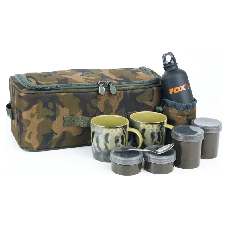 Designed using the same dimensions as Camolite Standard Storage Bag ensuring compatibility with both Explorer Barrow modelsFeatures stiffened Velcro internal dividerSupplied with 2 x ceramic mugs, 2 x large & 2 x small khaki storage screw top pots (ideal for tea, sugar and coffee) and 1 x stainless teaspoonAlso comes supplied with a 250ml Fox-branded Aluminium bottle with accompanying thermally insulated bag (ideal for storing milk in)Additional internal storage to fit kettle, stove and gas canisterSide and top grab handles8mm heavy duty double zips100% treated polyester 500 denier material featuring unique Fox Camo patternDimensions: W39cm x H15cm x D18cm