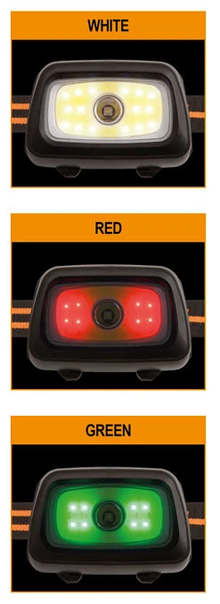 Drei Farboptionen – Weiß, Grün und RotVier weiße Helligkeitseinstellungen – 350 Lumen, 250 Lumen, 140 Lumen und 90 LumenZwei-Tasten-Bedienung (eine für Farbe und eine für Helligkeit)Einstellbarer ProjektionswinkelEinfaches, elastisches, verstellbares KopfbandBetrieb mit 3 x AAA-Batterien (nicht enthalten)Gewicht: 68g