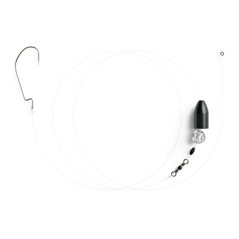 Der Haken aus Carbon-Stahl ist dabei extra gehärtet, ultra scharf und robust. Zudem wurde abriebfestes Fluorocarbon sowie ein schnell sinkendes und umweltfreundliches Tungsten Weight verwendet. Jedes Stück ist handgefertigt, um hochwertige Knoten sicherzustellen.Eine vorgefertigte Carolina Montage, um direkt loszulegen100% bleifrei und umweltfreundlich durch die Verwendung von Tungsten GewichtenUltrascharfe High-End Haken aus Carbon Stahl reduzieren Fehlbisse nahezu komplettHandgefertigt um hochwertige Knoten sicherzustellenDetails: 8.8g Tungsten Bullet Weight, 0.235 Vorfach aus 100% Fluorocarbon 3.6kg, Offset Haken Grösse 2, Länge 85cm