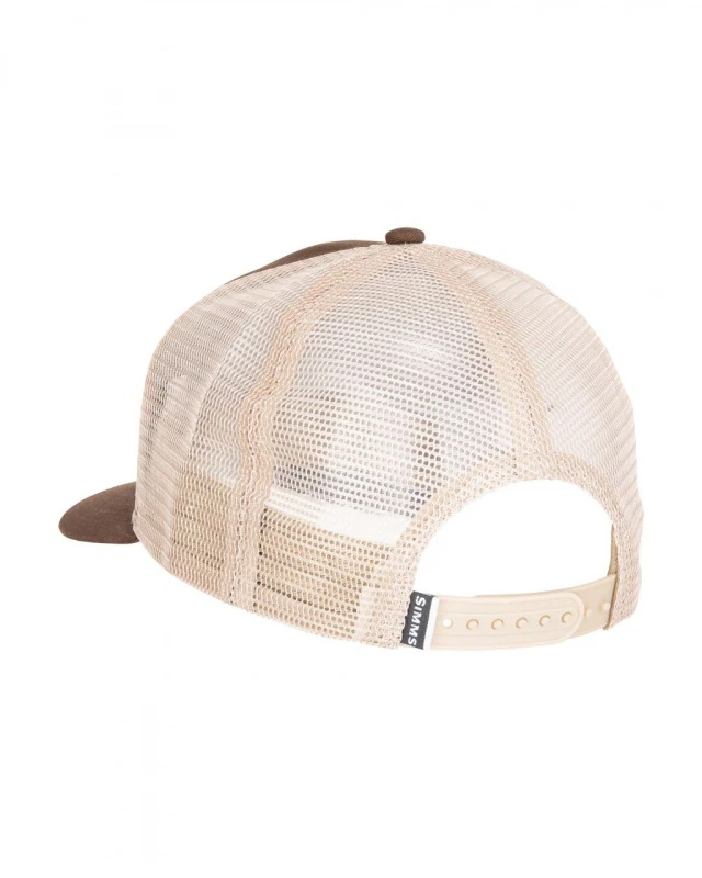 Trucker-Cap mit braun/beigem Hauptstoff und orangefarbenem Logo.