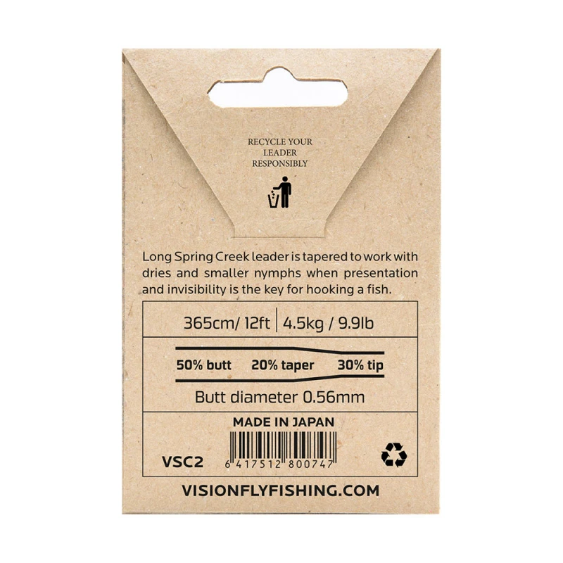 Vision’s 12 Fuß langes Spring Creek Vorfach ist verjüngt, um mit Trockenfischen und kleineren Nymphen zu arbeiten, wenn die Präsentation und Unsichtbarkeit der Schlüssel zum Angeln ist.